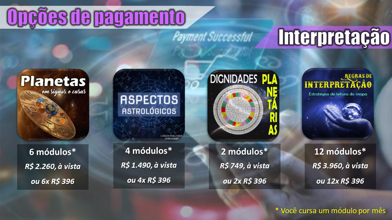 No primeiro módulo, você verá o que representam os planetas em signos e casas e, também, conhecerá os significados do Sol em signos e casas. Os outros planetas são apresentados nos módulos seguintes: